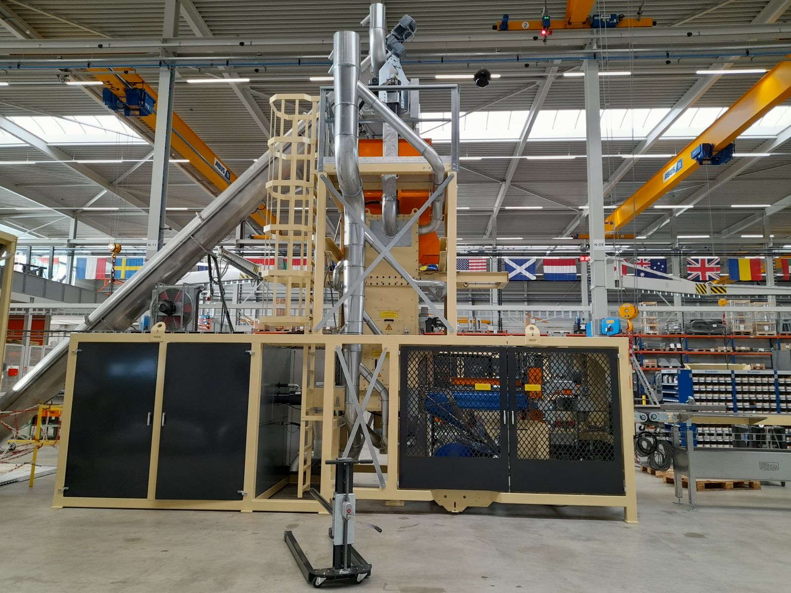 Inklusive Edelstahltrichter mit Förderschnecke. Welches mit einer automatischen Reinigungsfunktion ausgestattet ist. Dies ist bei einem Produktwechsel in der Verpackungslinie notwendig.