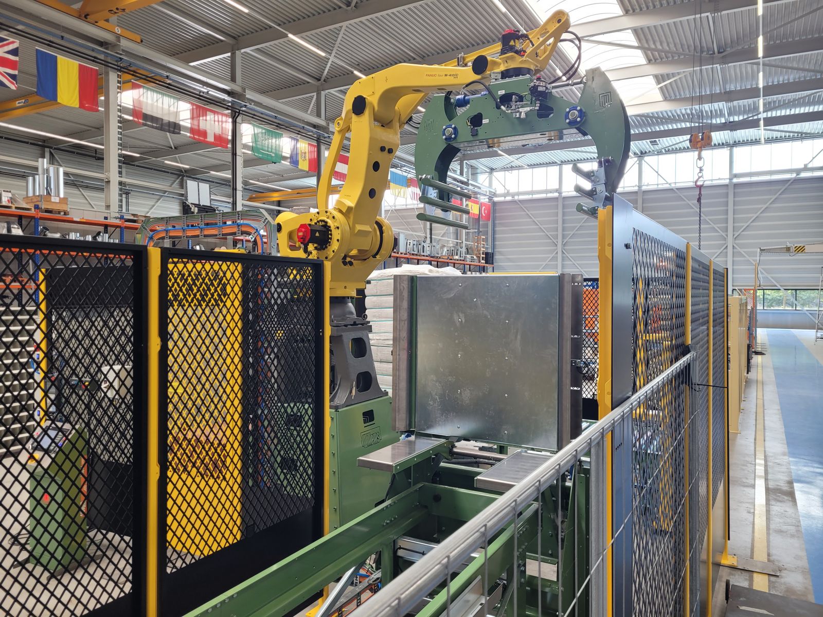 Die Linie ist vollautomatisiert und verfügt über einen automatischen Folienwechsler. Dies ermöglicht den Wechsel der Folienrollen, während der Pressvorgang zur Ballenproduktion kontinuierlich weiterläuft. Ein speziell entwickeltes System transportiert die Ballen und dreht sie in die richtige Position. Anschließend stapelt ein Roboter die Ballen auf einer Palette.