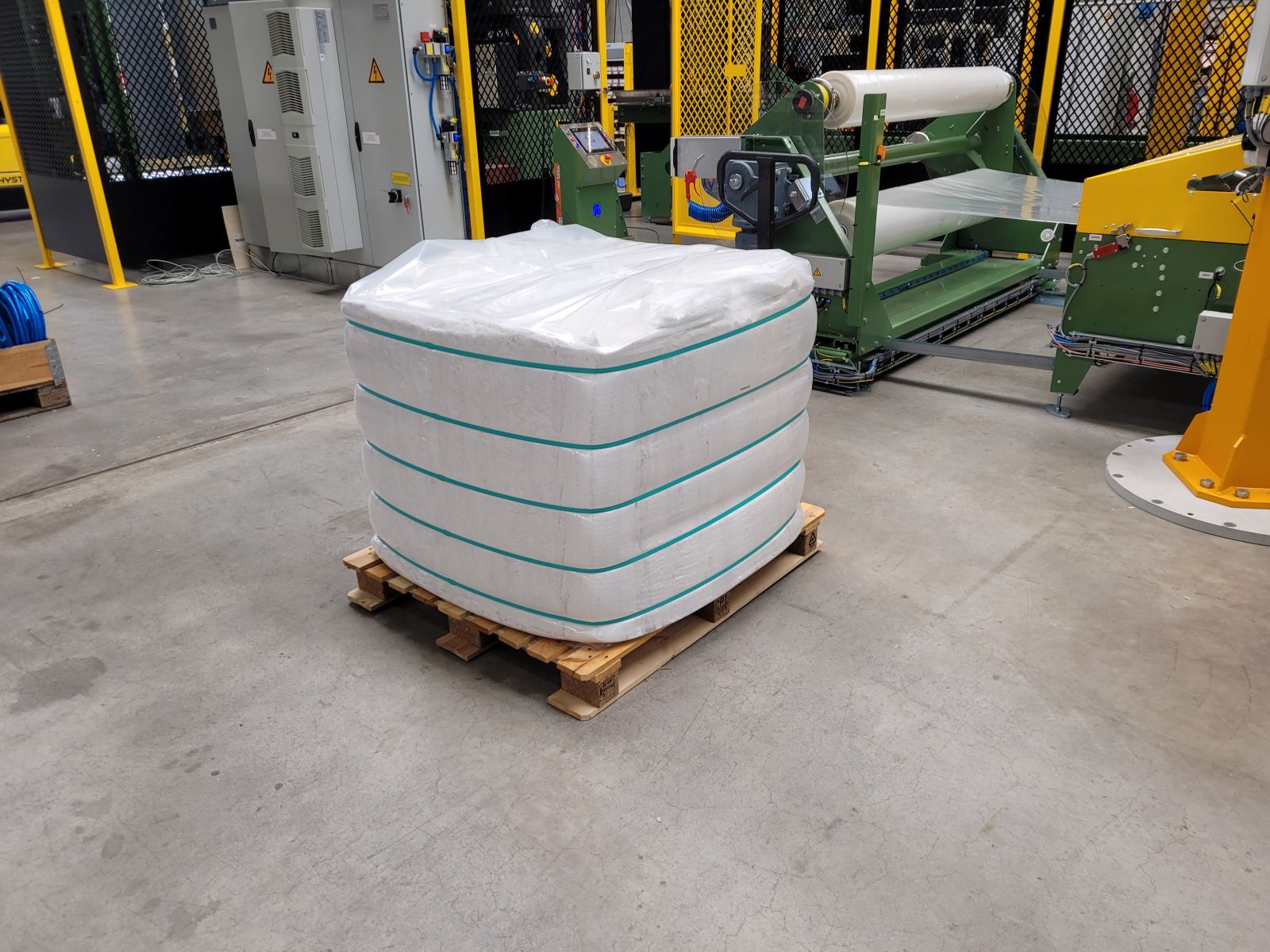 Willems hat in den Niederlanden ein maßgeschneidertes Verpackungssystem installiert. Es handelt sich um eine Kombination bewährter Willems-Techniken, vereint in einer vollautomatischen Ballenpresse. Es geht um die Produktion von „Maxi-Ballen“ mit Einblas-Glaswolle, einem extrem voluminösen Produkt. Die Ballen werden vollautomatisch in Flachfolie verpackt, inklusive Umreifungsbändern (Straps), um ein Ausdehnen des Produkts nach dem Verlassen des Presskanals zu verhindern. Das Kompressionsverhältnis liegt bei beachtlichen 25:1!