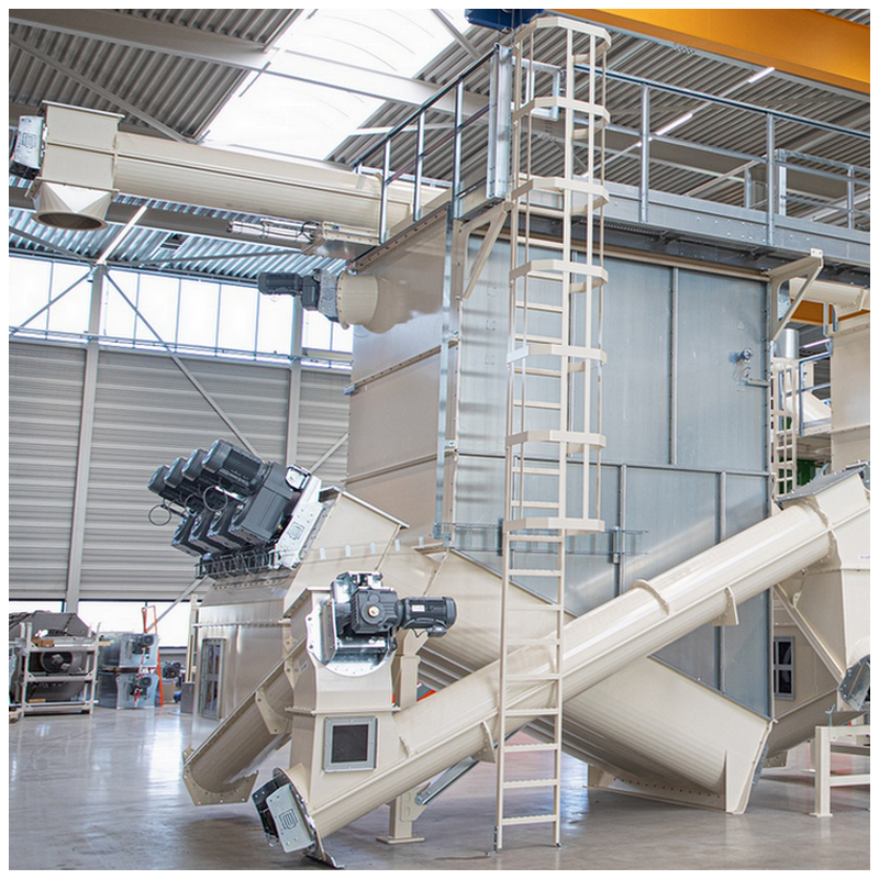 Complete infeed line with infeed hopper, eight transport augers and drum screen. In addition, an exi...
