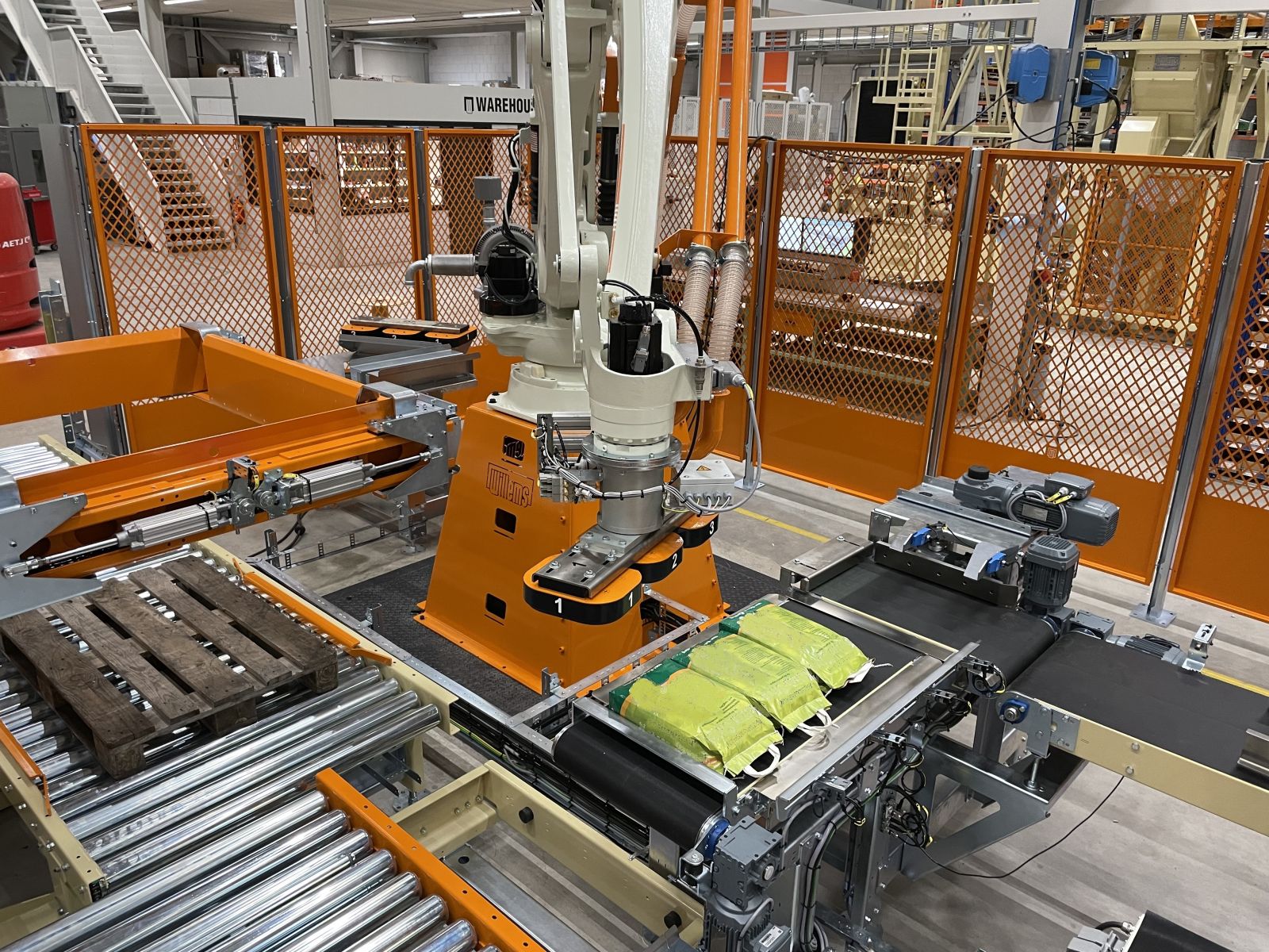 High capacity robot palletiser for stacking bagged litter granules. Capacity 1200 bags per hour.