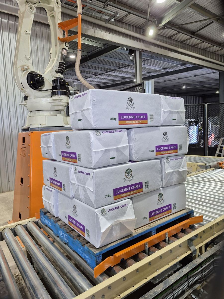Willems installed a complete packaging line for packing chaff. This product is used as a high-quality animal food, mainly for horses.The chaff needs special method for pressing and packaging, as this product does not tend to stick together after pressing. Willems developed a special method for handing this kind of product. The line includes a fully automatic robot stacking system. Bales are stacked square on a pallet, which leaves an opening in the middle. The robot puts automatically a bale in the middle opening, so no space is wasted on the pallet. Maximum pallet load is the key for shipping such product world-wide. Once the bales are stacked, a Willems stretch wrapper fully automatically wraps the finished pallet. So all is good to go to go, good quality product, logistically properly stacked on pallets, and well protected wrapped in foil. Again to a happy end user of the product.