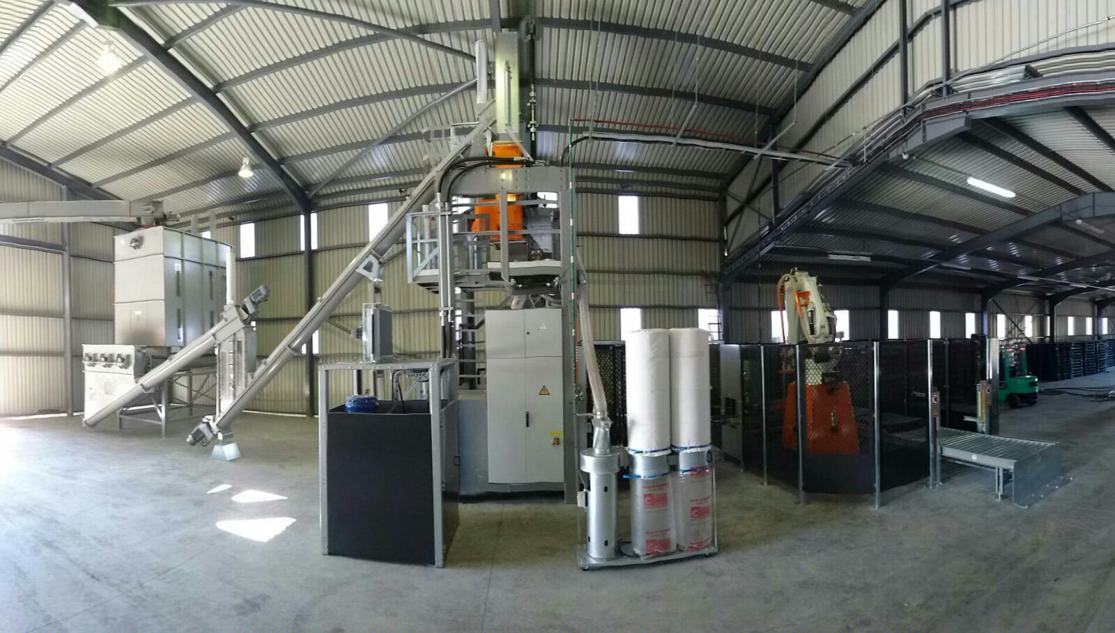 Bunker, presse à balles et robot pour l'emballage d'écorces de tournesol.