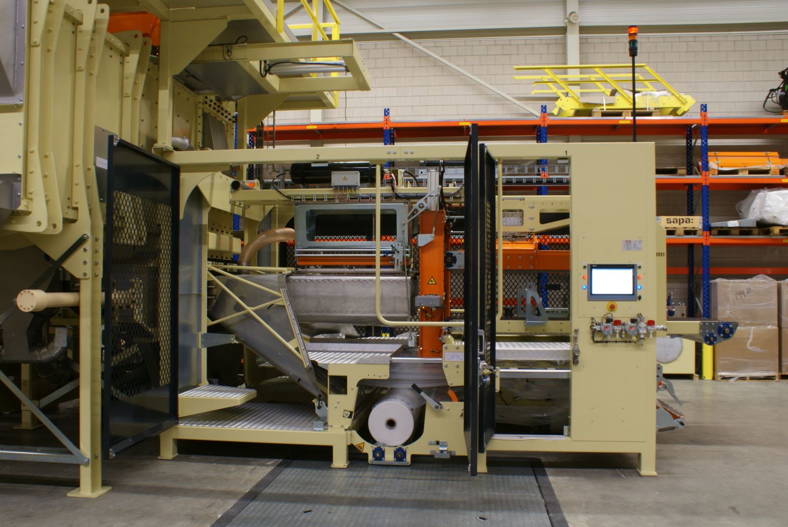 Die Maxiballenpresse presst und verpackt „Maxi Bales“ (Big Bale) bis 300 kg. Grundsätzlich eignet sich die Maxi Ballenpresse für Produkte mit einer geringen Dichte, wie Holzspäne, Glasfasern und Isoliermaterial. Aber auch andere Produkte können damit gepresst und verpackt werden. Die Maxi Ballenpresse kann beispielsweise auch hervorragend mit einem Zu- und Abtransportsystem, mit dem Reiniger und einem Roboter-Palettier kombiniert werden. Durch den Einsatz dieser Maschinen konnten wir bei einem Kunden in Frankreich