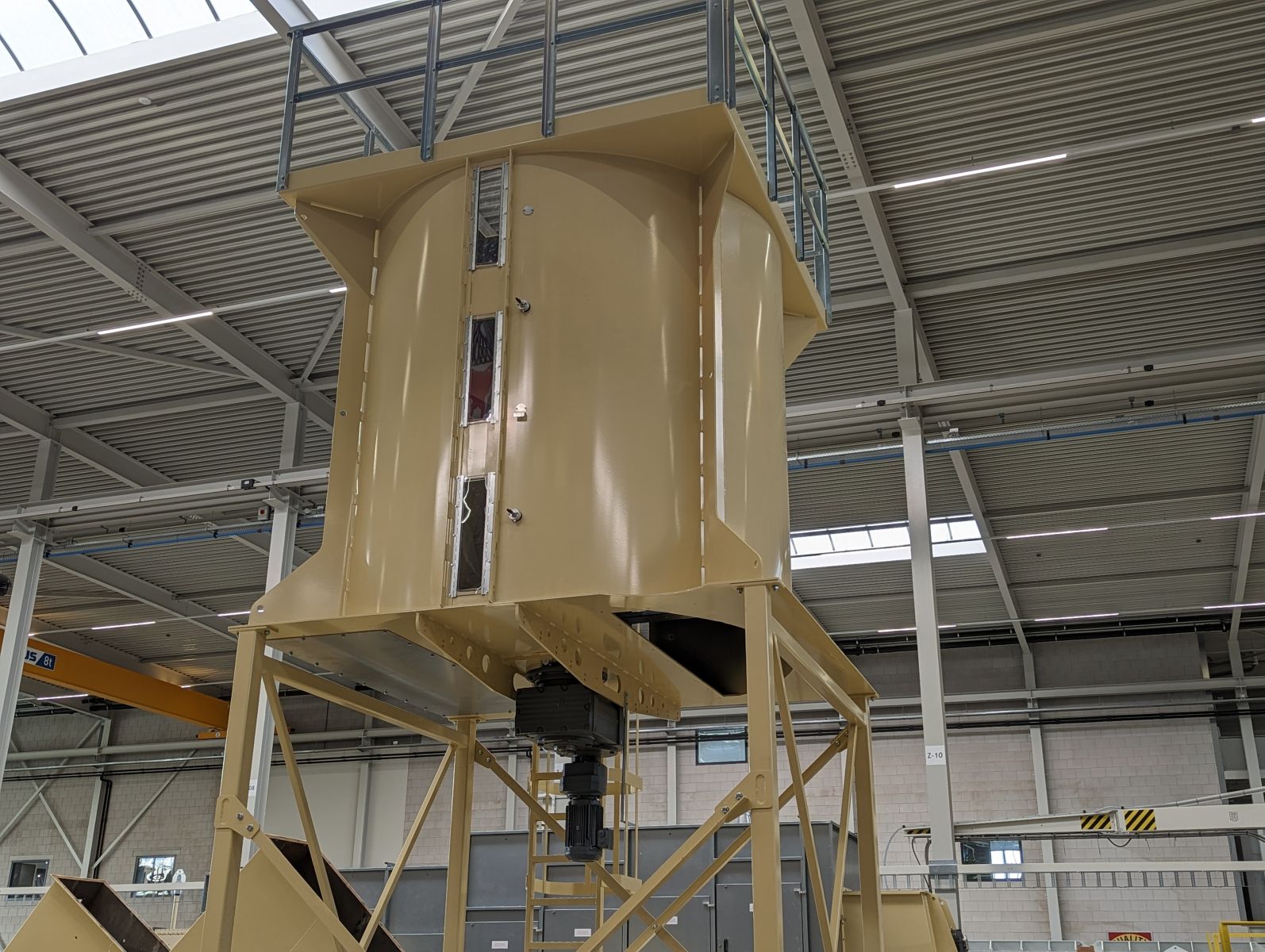 Ein Bunker sorgt für eine kontinuierliche Zufuhr. Der Maschinist befüllt den Bunker, von dem aus dann die dahinterliegenden Maschinen automatisch mit dem Produkt versorgt werden.