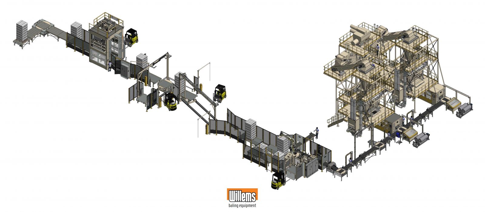Willems realised a complete project for glass wool packing and handling. Glass wool which is used as blowing wool for building insulation.