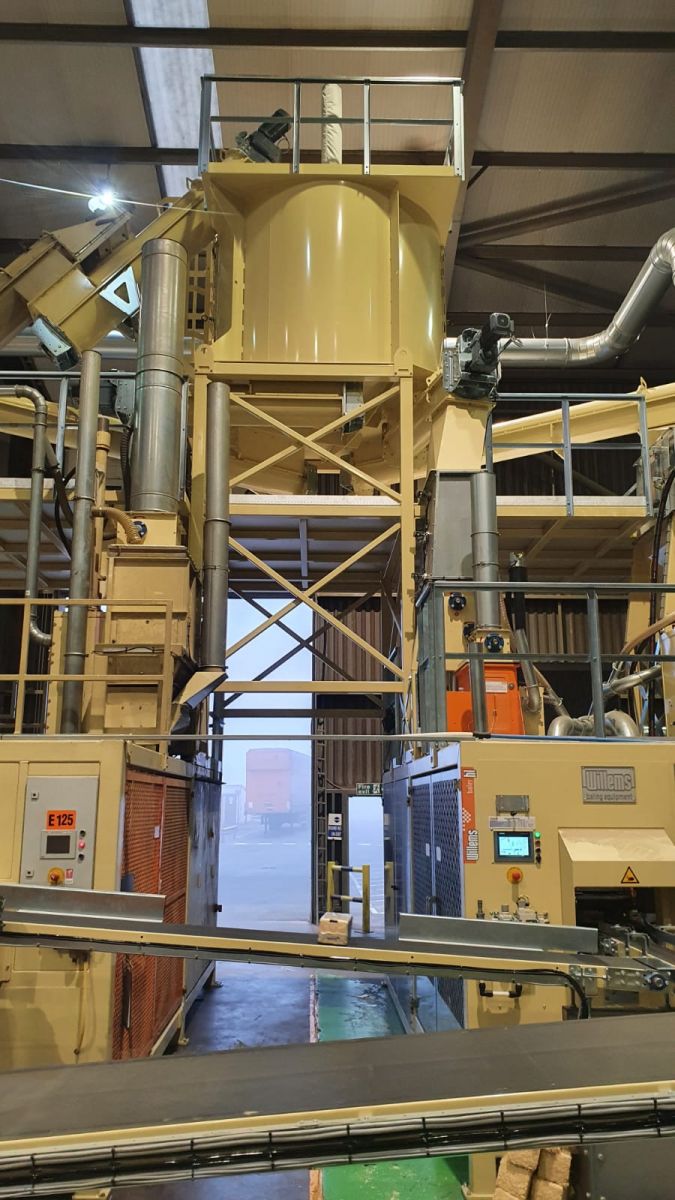 Komplette kleine Verpackungslinie. Die Linie besteht aus der Erweiterung des bestehenden Versorgungssystems, der Doppelballenpresse, der Bündelmaschine und des Roboterpalettierers zum Verpacken von 1400 Ballen pro Stunde. Ballen mit Streu für kleine Haustiere wie Meerschweinchen, Kaninchen und dergleichen.