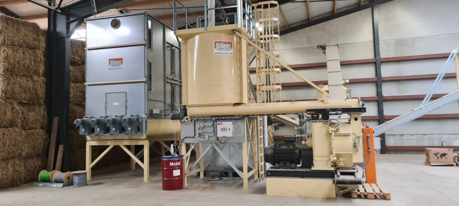 Pufferbunker, Konditionierung der Faser, Reifebunker, Dosierung zur Pelletpresse, Pelletpresse, Kühler, Staubabsiebung und Austrag der gepressten Pellets. Alles geliefert und installiert von Willems. Vollautomatische Steuerung.