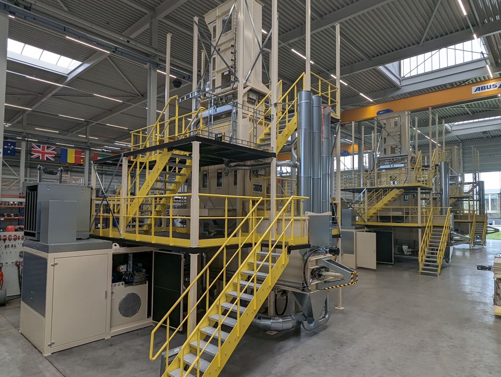 Drei Ballenpressen, ein Roboter-Stapelsystem um alle Ballen zu stapeln und ein stretch Hooder. Die Kapazität beträgt 7.7 Tonnen Glaswolle-Isolierung pro Stunde.