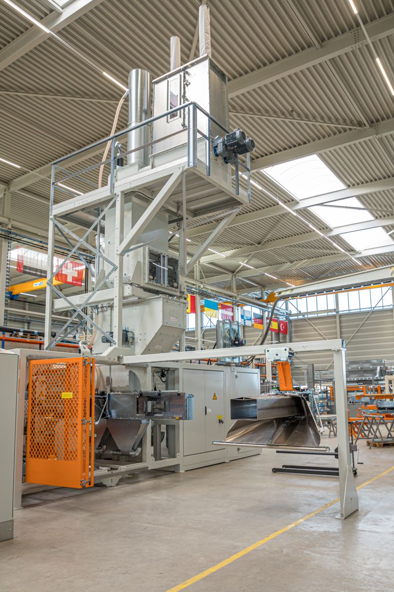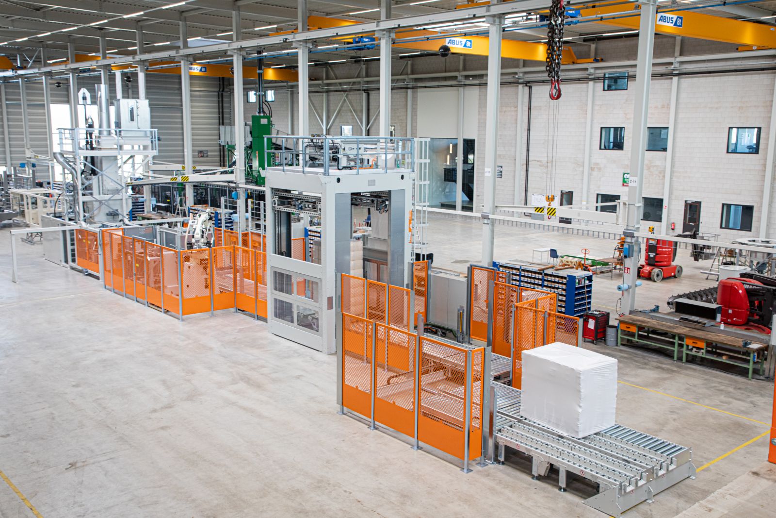 Voll ausgestattet mit einem Roboterstapler, einem automatischen Blechaufleiger und einem Ballenkipper. Eine vollautomatische Stretchwickelmaschine wurde hinzugefügt, um die gestapelten Ballen vor Wind und Wetter zu schützen. Das Ende der Linie besteht aus einem Rollenfördersammelsystem. Dabei werden die verschiedenen Palettengrößen nebeneinander oder hintereinander geformt, so dass ein Gabelstapler möglicherweise mehrere Paletten gleichzeitig aufnehmen kann. Um den Gabelstaplerverkehr auf ein Minimum zu beschränken.