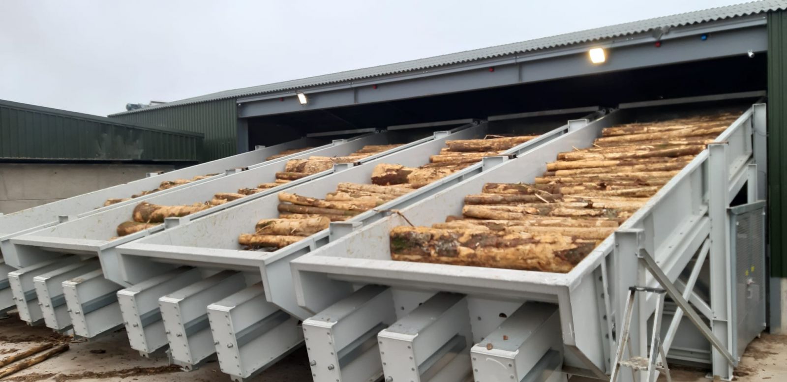 - With a crane logs can be placed on the chain conveyor for buffering and transporting the logs.