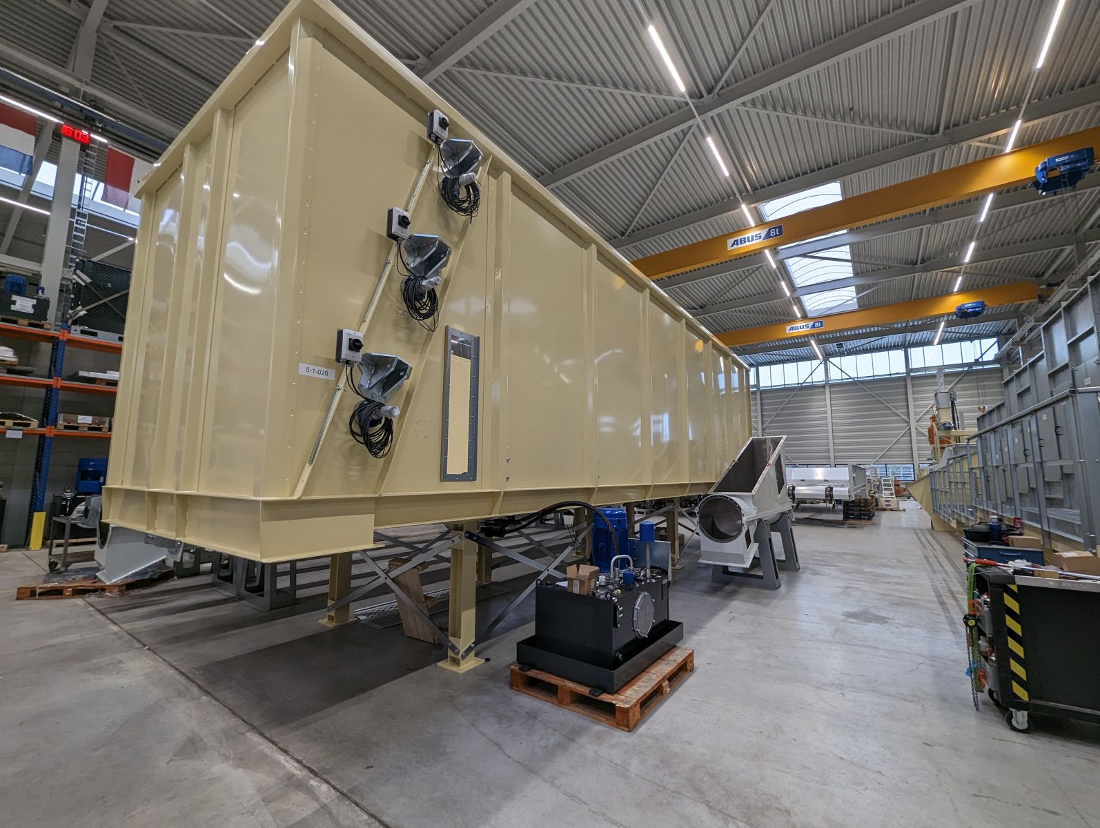 Complete infeed line with infeed hopper, eight transport augers and drum screen. In addition, an existing baler with infeed auger was disassembled at another location and rebuilt at this location.