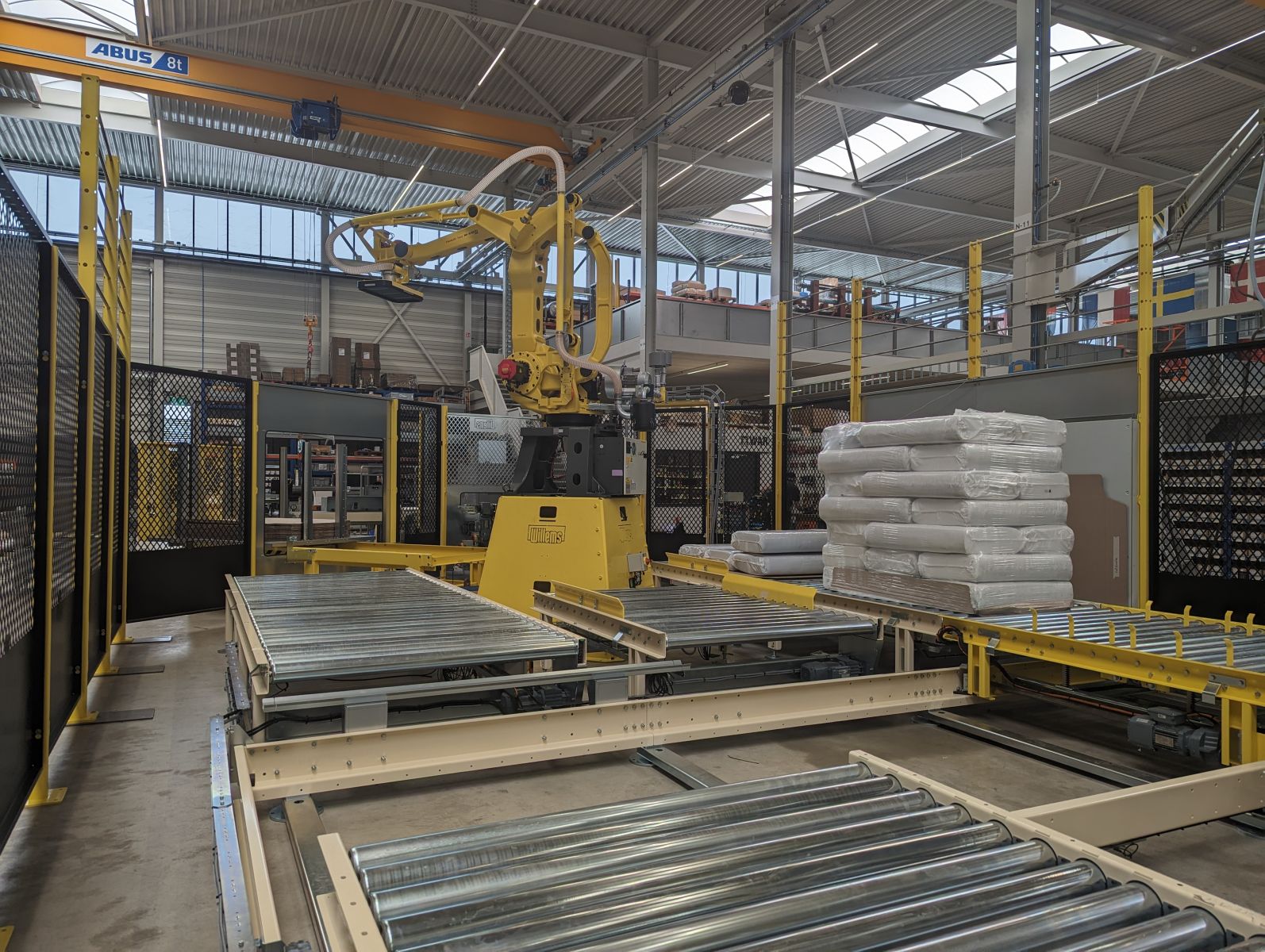 In total 3 balers, 1 robot stacking system for stacking bales coming from all 3 balers. Plus a full automatic stretch hood machine, for packing the finished pallets in a plastic hood. Good for a total capacity of ca 7.7 tons/ hour of glass wool packing.
