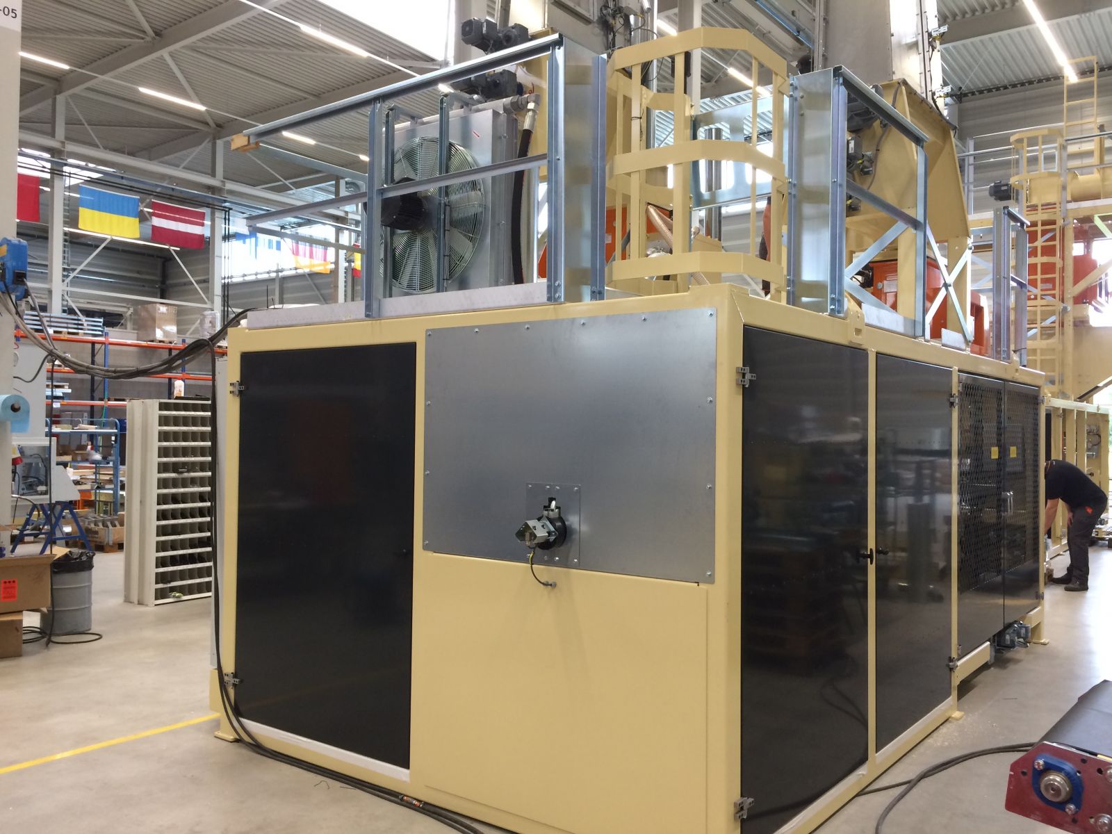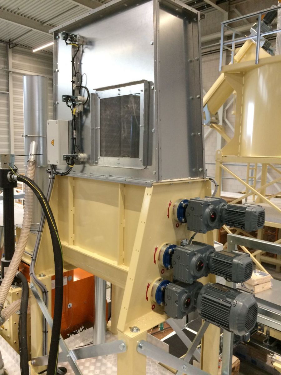Complete small packaging line. The line consists of expanding the existing supply system, double baler, bundling machine and robot palletiser for packaging 1400 bales per hour. Bales with litter for small pets such as guinea pigs, rabbits, etcetera.