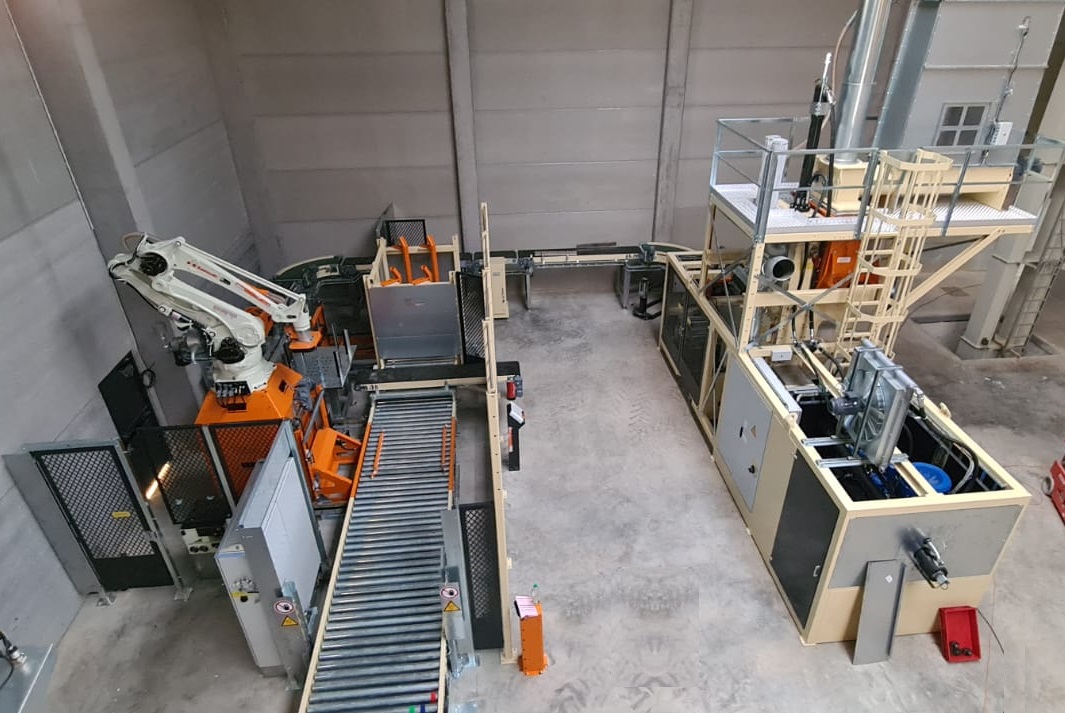 The baler processes more than 5,000 kg of flax per hour and the robot stacks the bales on a pallet. The stretch hooder (Hooder L) then pulls a protective stretch hood over the pallet load. The stretch hood cover offers complete protection against dirt, dust and moisture and also protects the products against scratches and surface damage.