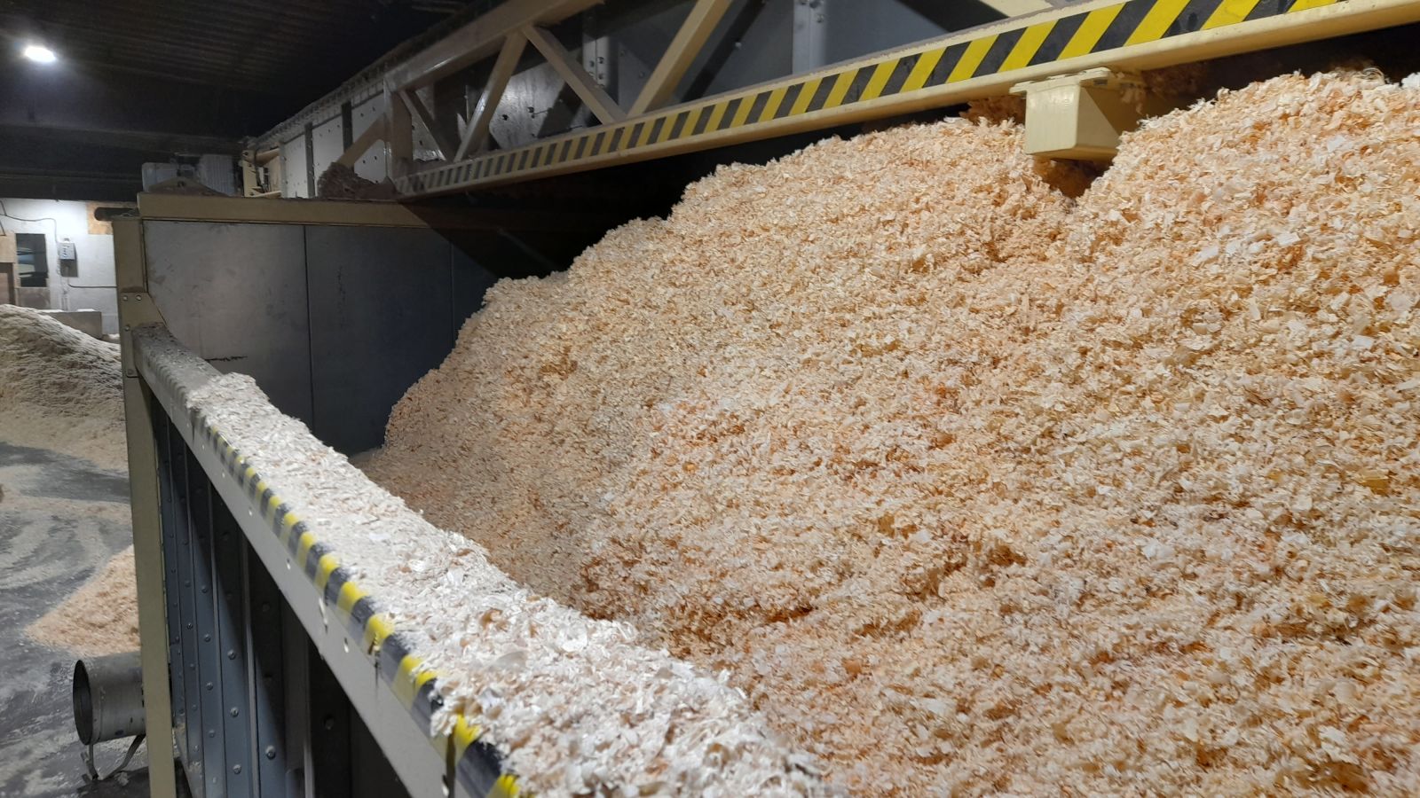 The fresh wood shavings are fed out using a chain scraper and sceened in a star screen. The wood shavings are then buffered in a bunker and the sieved oversize pieces are exported separately.