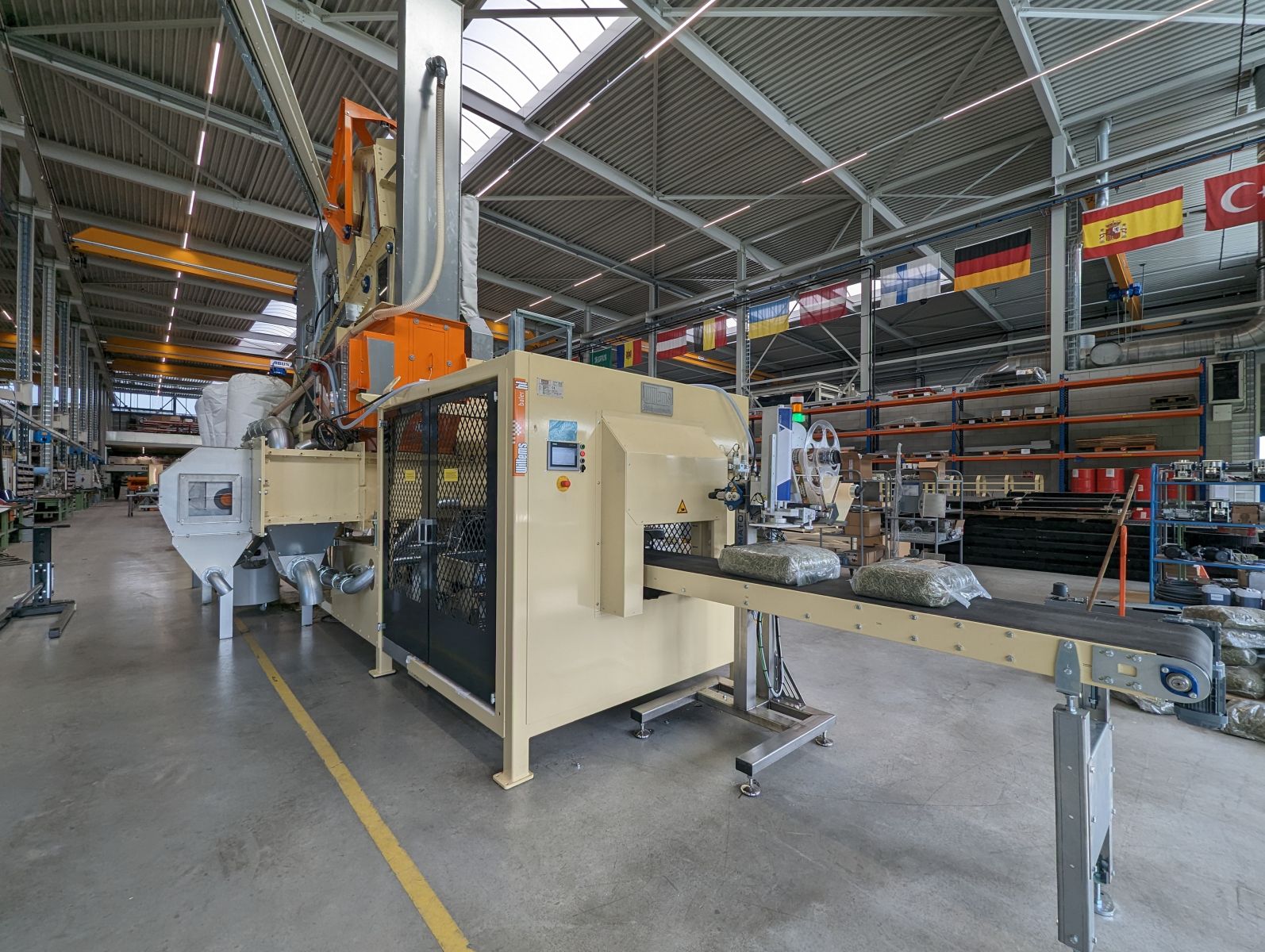 A belt dosing conveyor feeds the product into the electronic net weigh hopper. Software makes sure that the desired weight will be gained automatic. The settings in the weighing program adjust automatic. This means that the user of the machine only has to give in the desired end weight. When the bulk density of the product varies, the bale weight stays constant.