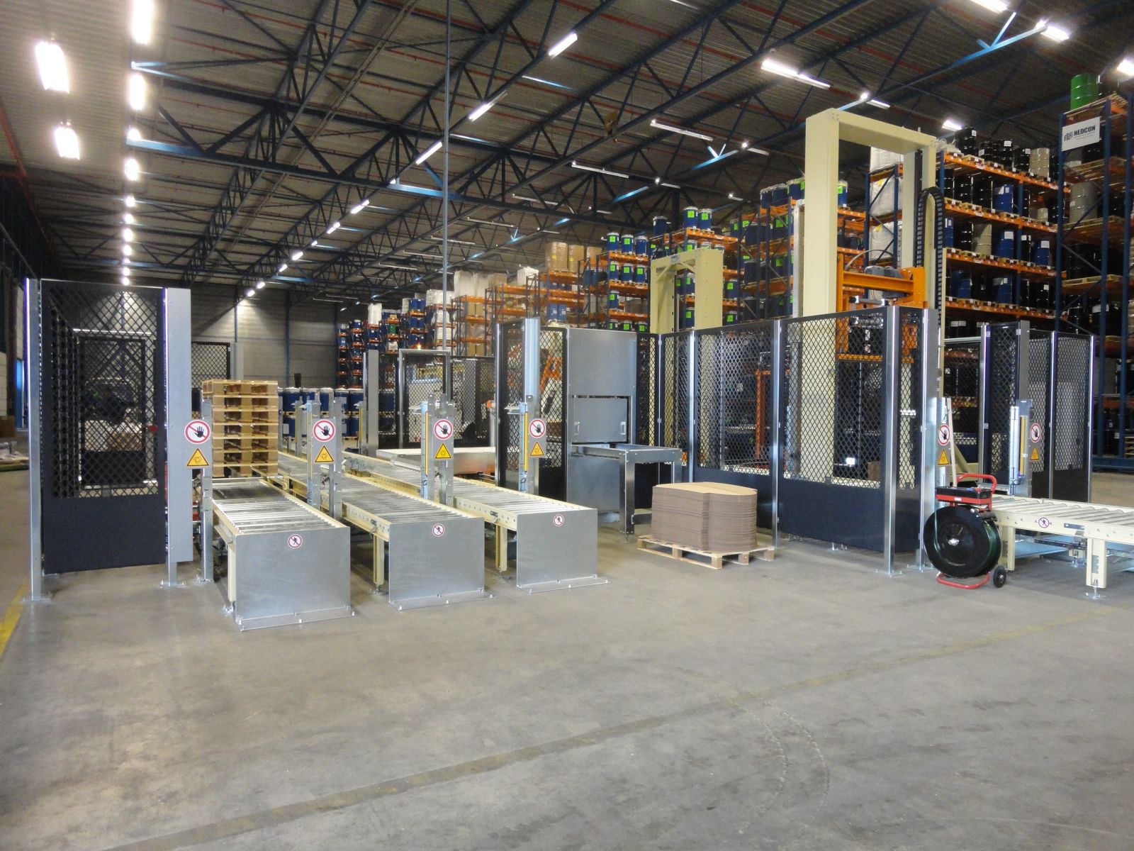 A robot that labels the barrels, places them on a pallet and protects the lid with cardboard. The barrels get wrapped.