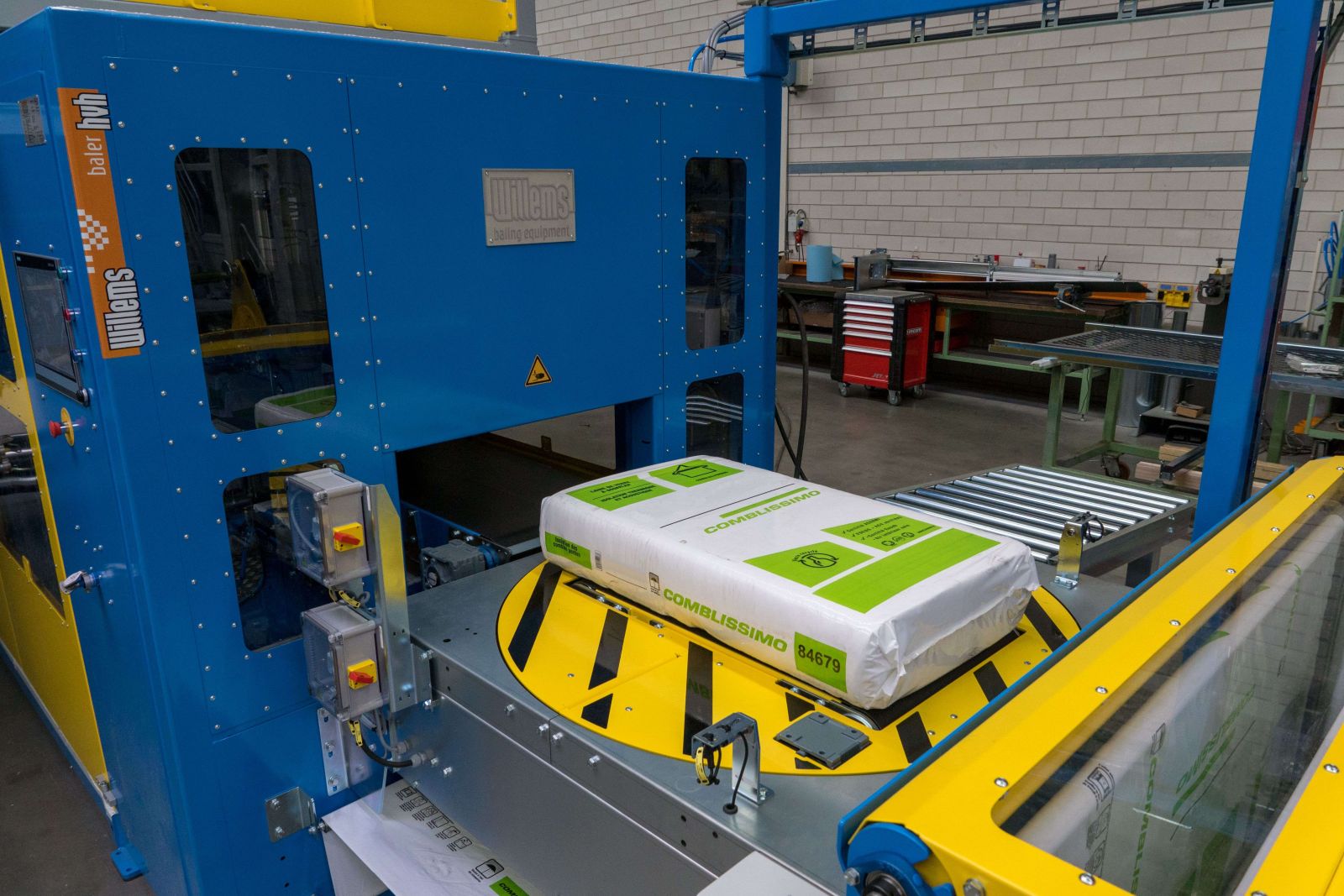We have supplied a HVH baler. This is a baler suitable for the packaging of extreme bulky products. Developed for 24/7 production, non-stop. Including automatic foil changing unit. And a robot line and winding machines so everything can be packed dust-free and water-tight for transport.