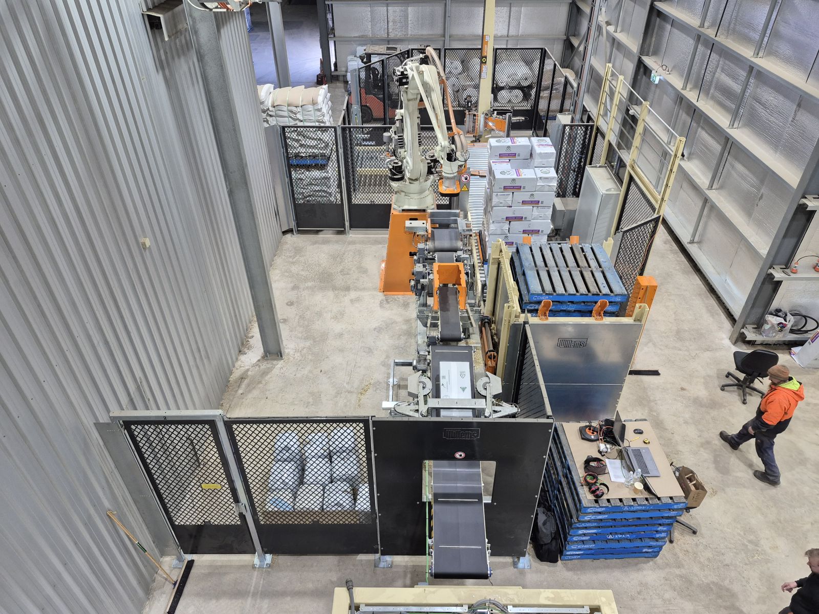 Willems a installé une ligne d’emballage complète pour le conditionnement des balles de balles de céréales (kaf). Ce produit est utilisé comme aliment pour animaux de haute qualité, notamment pour les chevaux. Comme ce produit a du mal à rester compact lors du pressage, il nécessite une méthode spéciale de pressage et d’emballage. Willems a développé une méthode spécifique pour le traitement de ce type de produits. La ligne comprend un palettiseur robotisé entièrement automatique. Les balles sont empilées en carré sur une palette, en laissant un espace vide au centre. Le robot place automatiquement une balle debout dans cet espace central, afin qu’aucun espace ne soit perdu sur la palette. Un chargement maximal des palettes est essentiel pour l’expédition mondiale de ce type de produits. Une fois les balles empilées, une banderoleuse Willems emballe automatiquement la palette terminée. Tout est donc prêt pour l’expédition : un produit de haute qualité, correctement palettisé et bien protégé sous film plastique. De nouveau en route vers un utilisateur final satisfait.