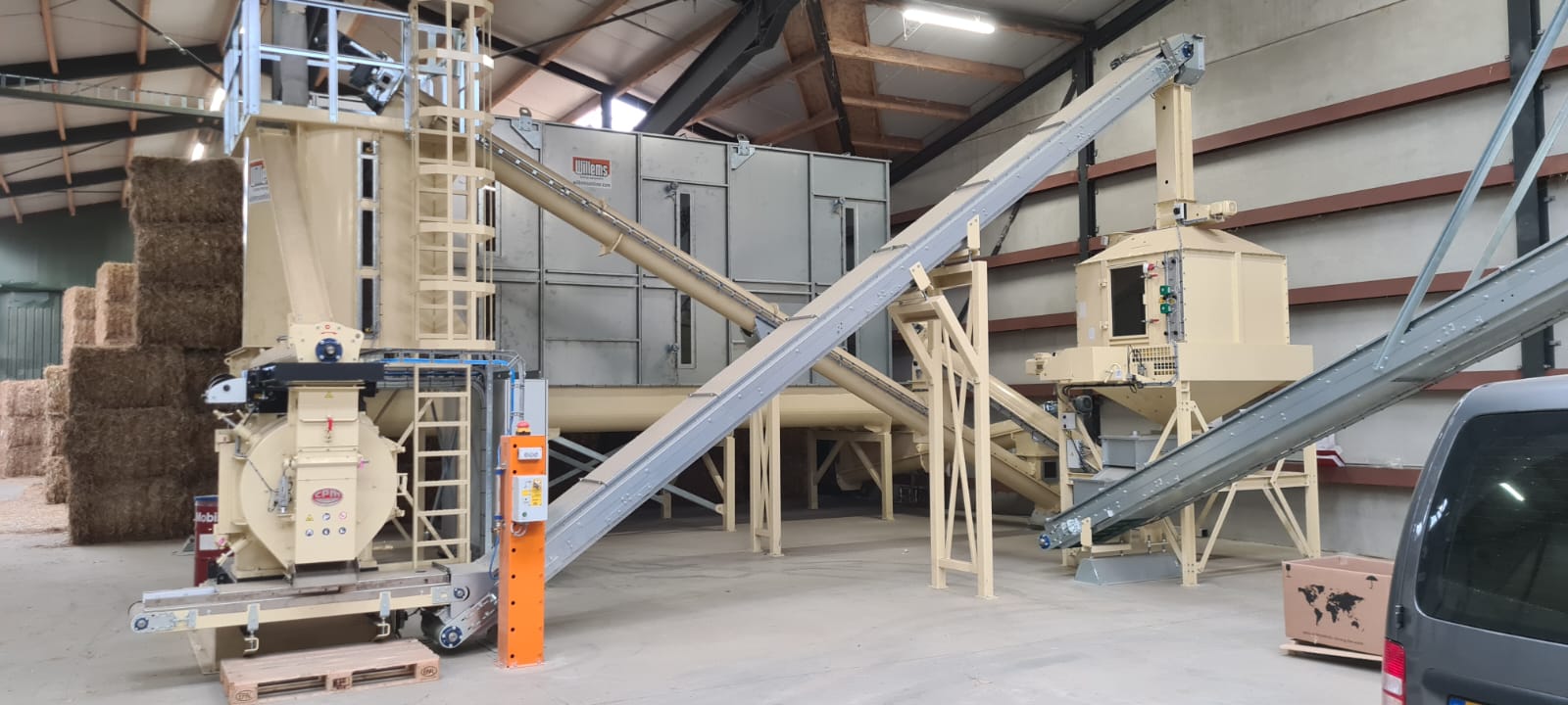 Bufferbunker, conditionering van de vezel, rijpingsbunker, dosering naar korrelpers, korrelpers, koeler, afzeven van stof, en afvoer van geperste korrels. Allemaal geleverd, en geplaatst door Willems. Volledig automatische besturing.