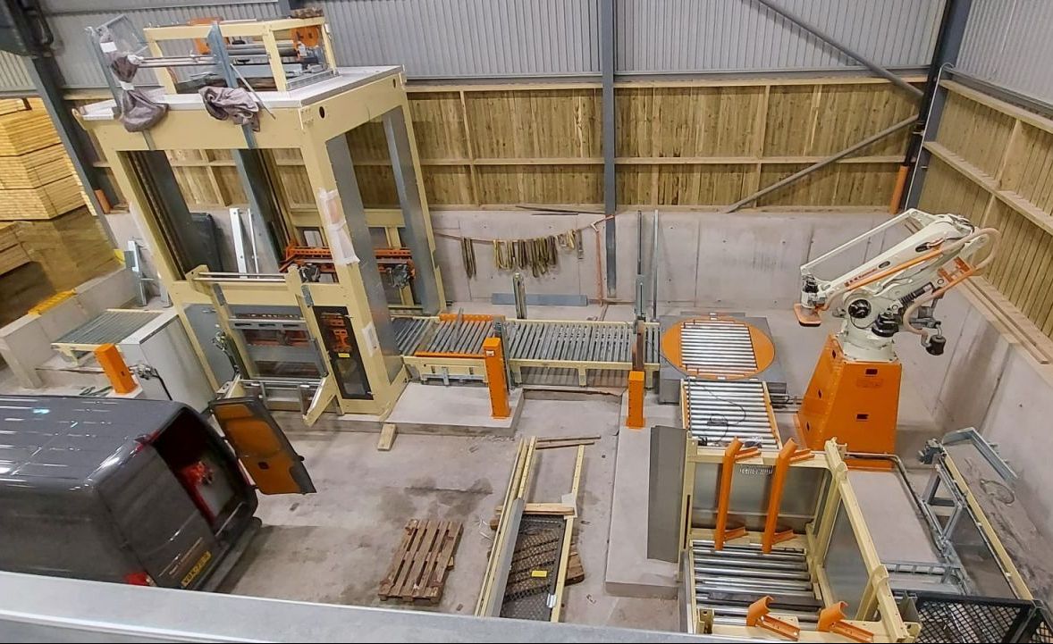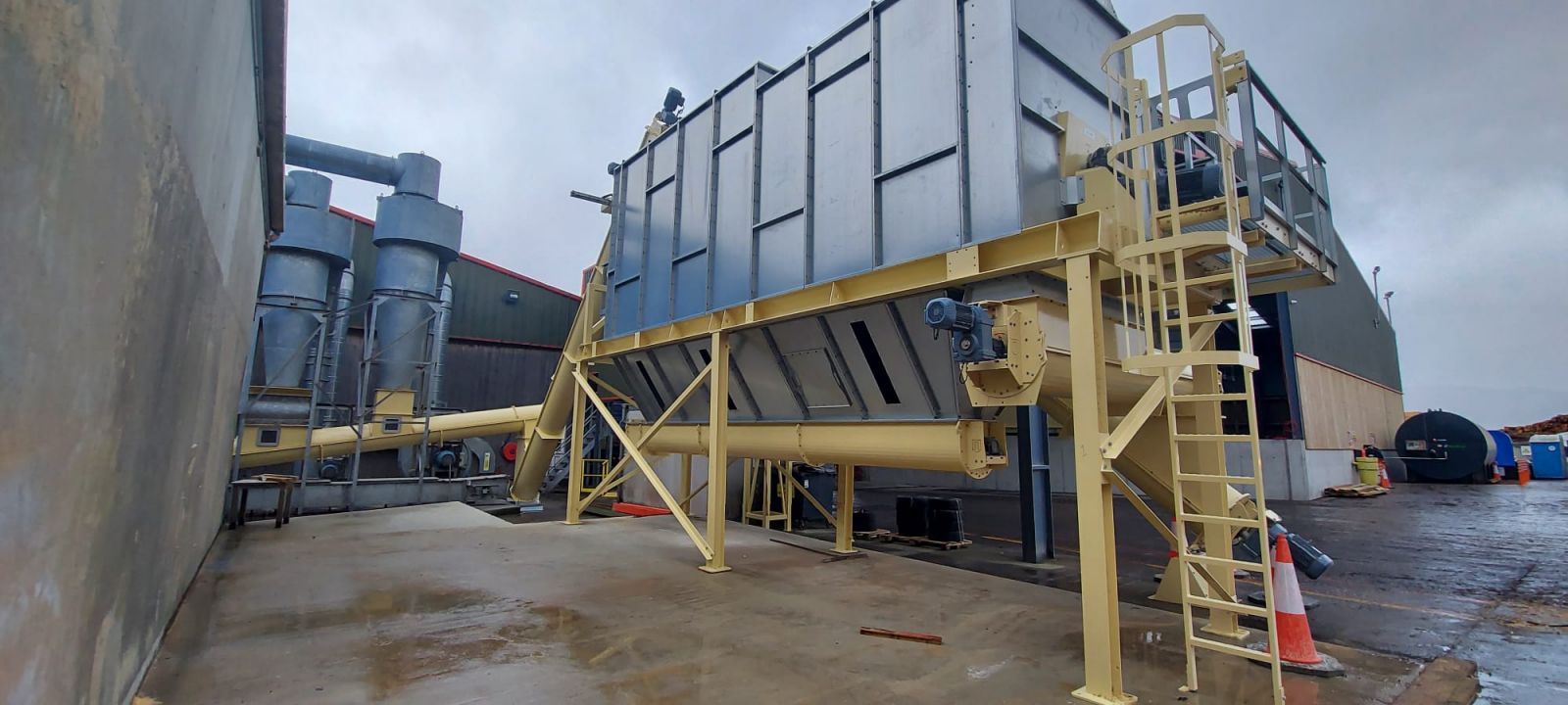 Complete verpakkings- en verwerkingslijn voor houtkrullen. Complete turn key installatie voor bufferen van houtkrullen, 105 m3 bunker met een transportvloer. Deze bunker buffert de houtkrullen, zodat de schaverij met meerdere ploegen kan produceren, terwijl het inpakken slechts in één ploegendienst plaatsvindt. Een trommelzeef is geïntegreerd om de fijnere deeltjes van de grotere houtkrullen te verwijderen, wat voor bepaalde soorten strooisel gewenst is. Het gereinigde schaafsel wordt in balen geperst en verpakt in degelijke logistiek correcte balen. Een robot stapelsysteem stapelt de balen automatisch op pallets. Nadat de balen op de pallet zijn gestapeld, worden ze automatisch door een Willems rekhoesmachine getransporteerd, om de balen te beschermen tegen regen en voor stabiliteit. Wederom een complete turn key fabrieksbouw en gemonteerd door Willems.